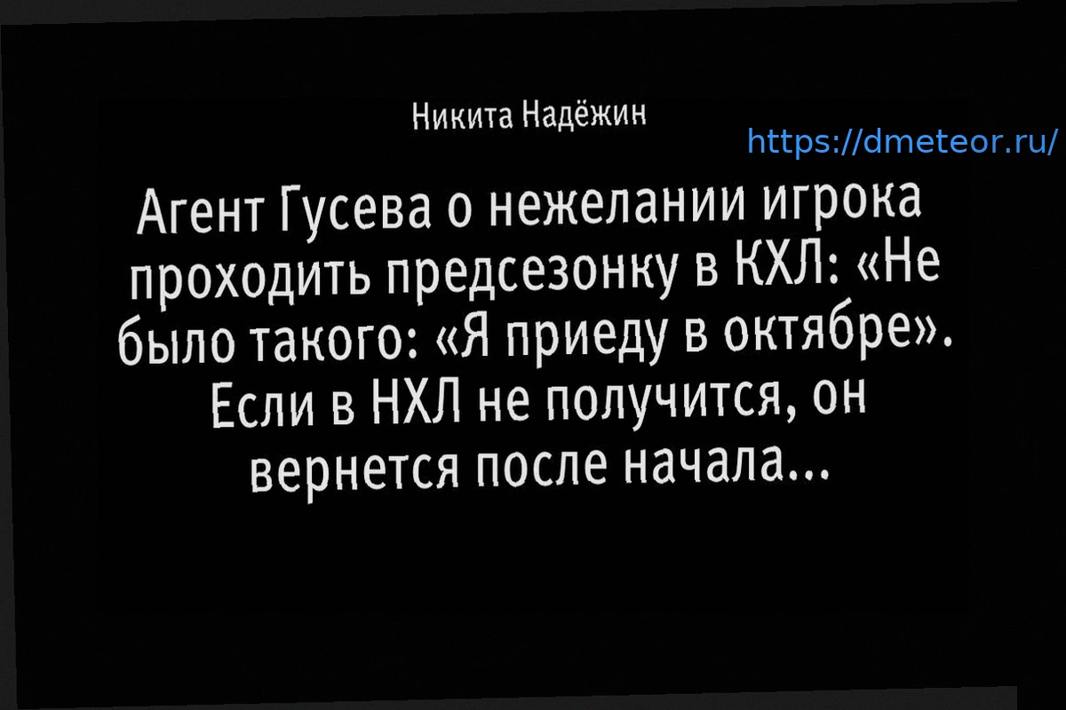 Агент Александр Черных, являющийся представителем нападающего московского «Динамо» Никиты Гусева, поделился информацией о дальнейших планах своего клиента. В своем заявлении для издания «Спорт-Экспресс» Черных отметил, что от самого Гусева не поступало обращений или пожеланий о продолжении его профессиональной карьеры в Национальной хоккейной лиге (НХЛ).